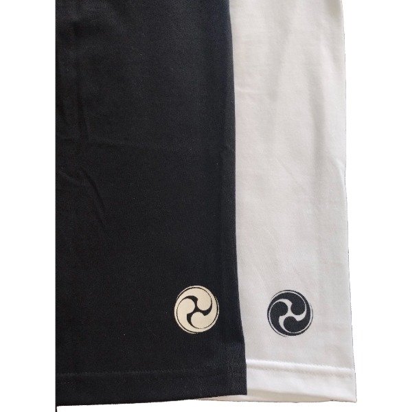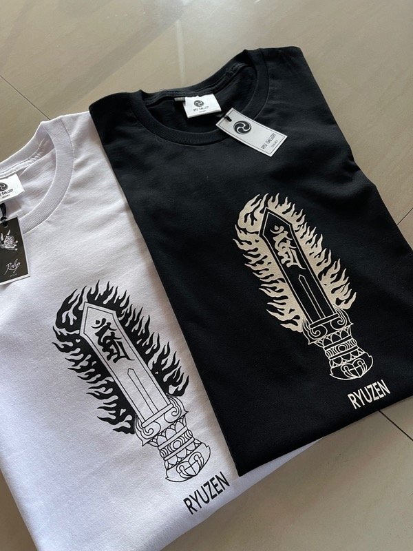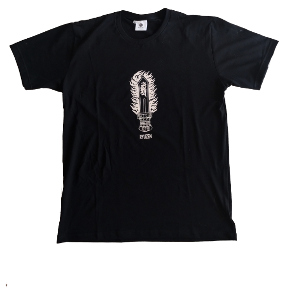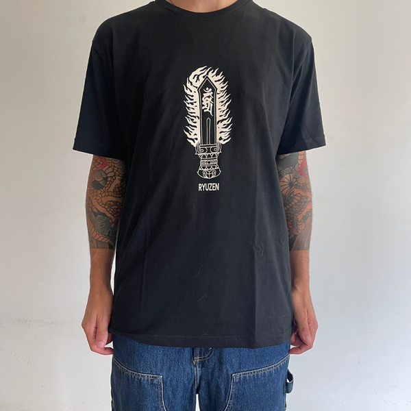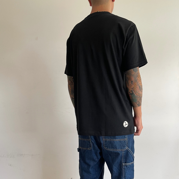 Remera negra o blanca con estampa serigráfica adelante y logo atrás.